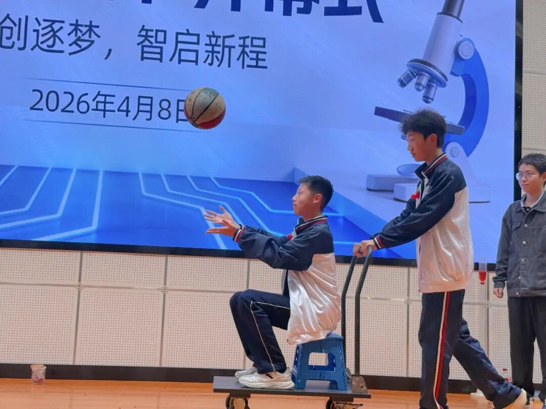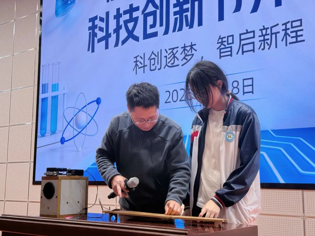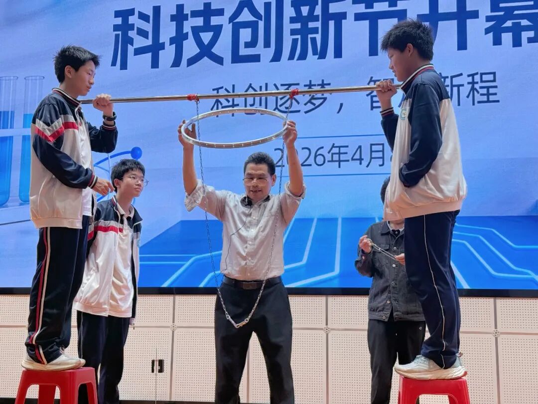 巧用声波反射、定向传导原理,声音虚实交错、方向奇妙错位,明明声源在一侧,声响却从另一边出现。新奇现象引得同学们惊叹连连、踊跃猜测,现场欢呼不断,轻松揭开声音传播的神秘面纱。 酒杯轻轻震动,小球灵动跳跃移动!看不见的声波蕴藏巨大能量,声学共振魔法奇妙无比,同学们目不转睛,纷纷直呼太神奇。 铁锅化身神奇扩音器,远距离低语也能清晰传递,沉浸式感受声波聚焦魅力,全场静静聆听,沉浸式领略声学奇妙。 超强电磁瞬间发力,物体飞速弹射而出!震撼的实验效果引爆全场,阵阵惊呼此起彼伏,氛围感直接拉满。 快速抽离圆环,瓶身稳稳垂直下落,趣味力学小魔术,直观展现惯性原理,同学们目不转睛、拍手喝彩。 无需琴弦也能奏响悦耳乐章!电生磁、磁振发声,奇妙灵动的电磁音律,深深吸引在场每一位学子。 行驶小车竖直抛球,小球依旧精准落回原位,生动讲解惯性与相对运动,同学们恍然大悟、收获满满。 惊艳视觉奇观来袭!钢圈下落瞬间自动缠绕链条,奇妙角动量现象震撼全场,大家目不暇接、赞叹不已。 两支飞箭同台竞速比拼,快慢胜负暗藏物理玄机,同学们凝神观战,在趣味比拼中学懂动能与阻力知识。 我校特邀县老科协会员朱向阳老师、信丰中学资深科技骨干教师施国富联袂登台,匠心演绎精彩纷呈的趣味科普盛宴。两位名师精妙呈现九大经典物理趣味实验,全方位展现声学共振、力学奥秘、电磁奇观,寓理于趣、震撼直观、引人入胜。现场奇象迭起、妙理纷呈,奇妙现象不断惊艳全场。同学们目不转睛、踊跃互动、惊叹连连,不时发出阵阵欢呼。老师们深入浅出拆解原理、细致科普,在直观震撼的实验场景中揭开科学奥秘,深深点燃全体师生探索求知热忱与科创追梦向往。